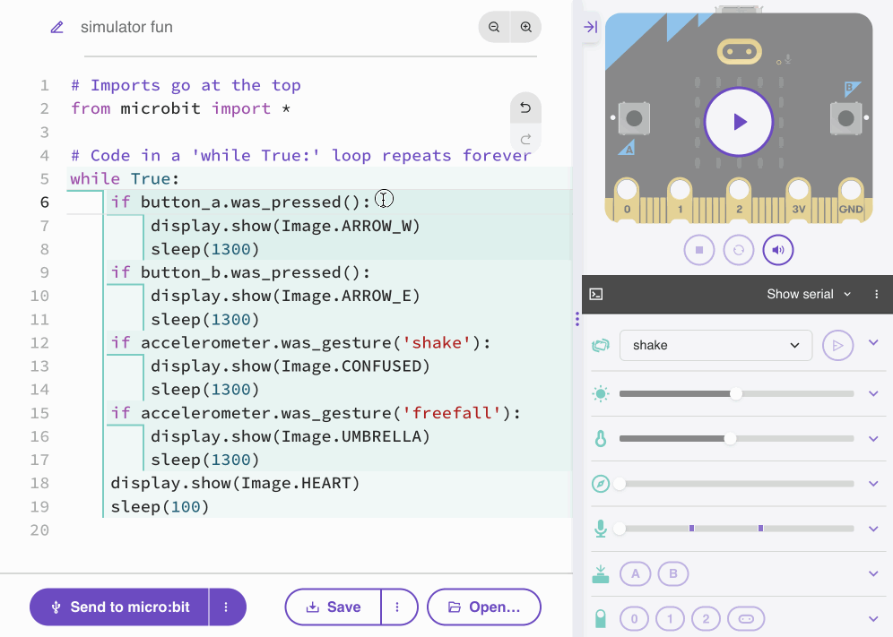 Including simulating buttons, gestures, light levels, temperature, compass, sound, radio, serial pins and data logging.